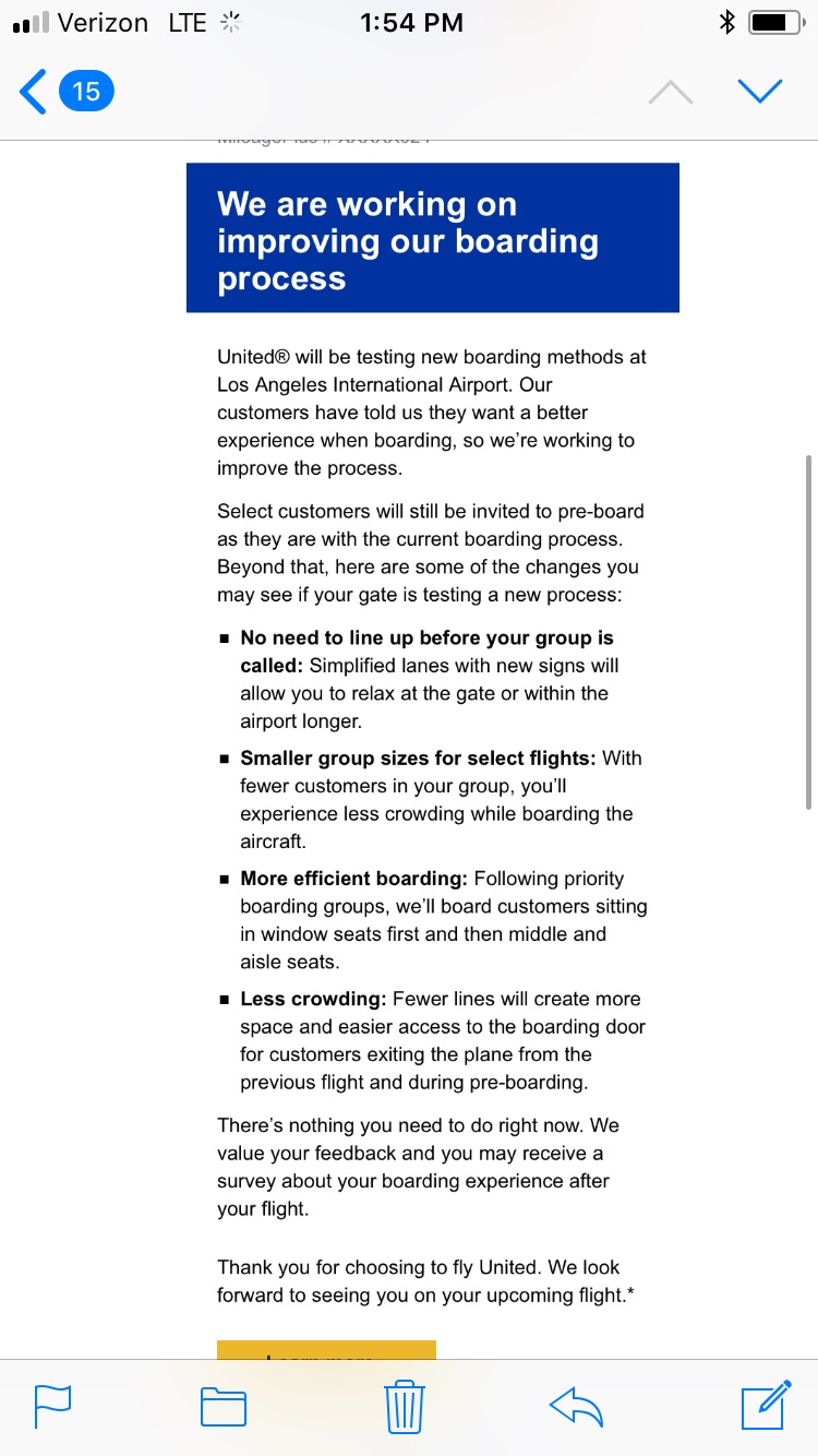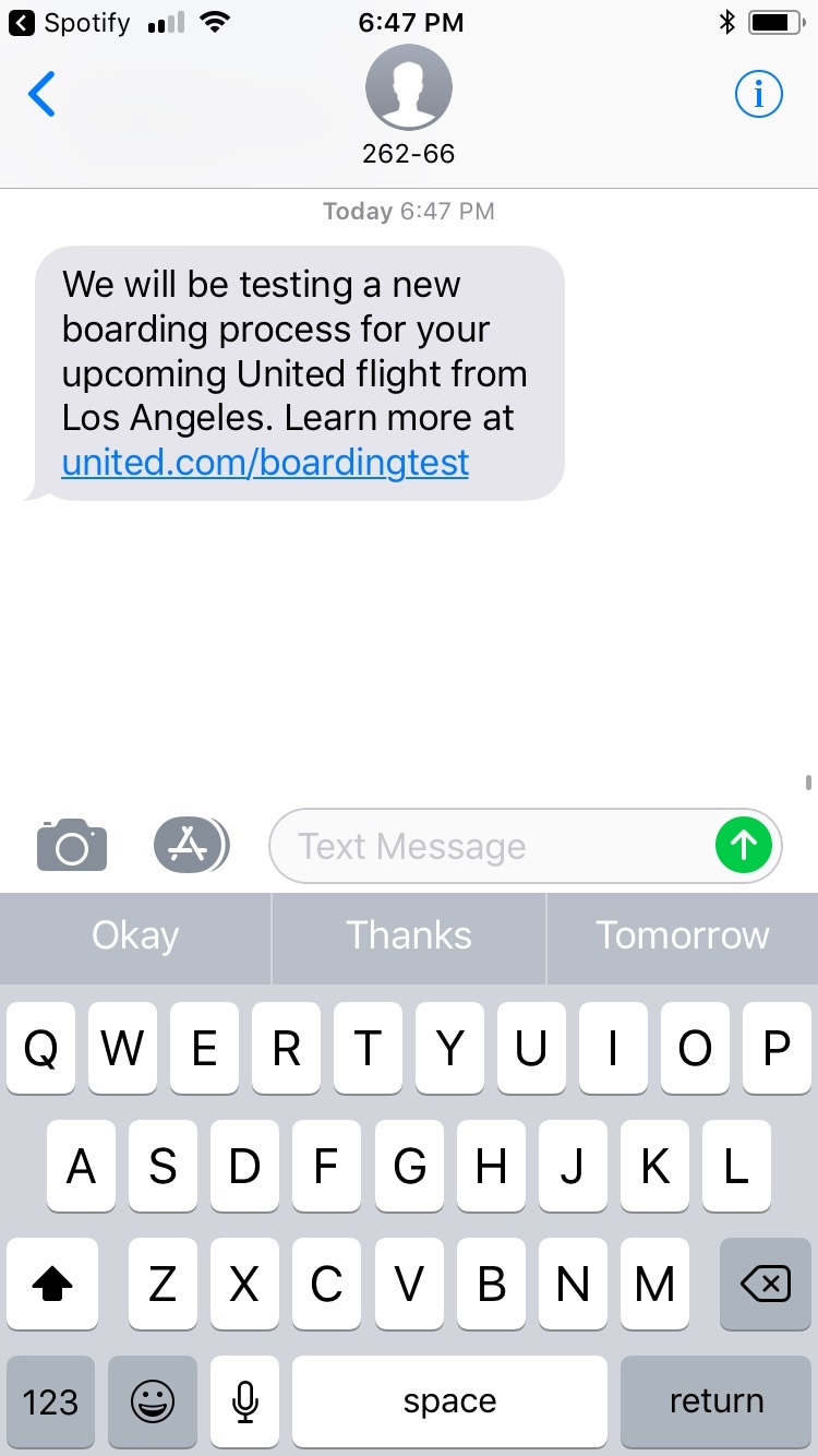 A day before a flight from LAX to Honolulu, I received an e-mail from United letting me know that the airline would be testing out a new boarding process for my flight. And a few hours later, they sent a follow-up text.